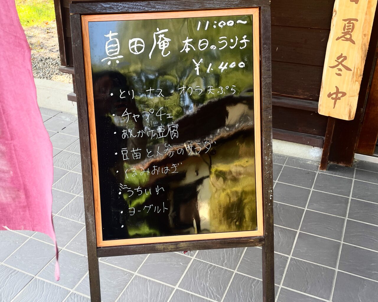 本日のランチメニューの看板が出ていました。季節野菜がふんだんに使われたメニューは、毎回変わります。