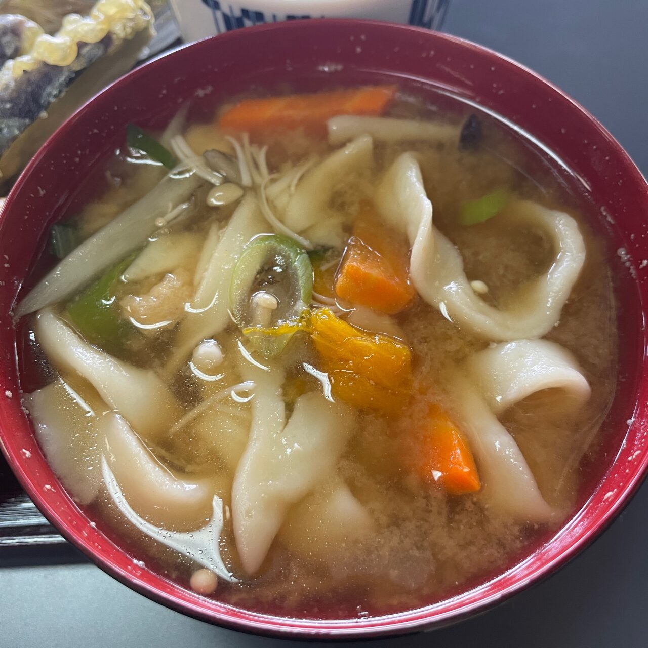 女性スタッフの方に「うちいれ」とは何ですか?と聞くと、打ったうどんをそのまま汁に入れるから「うちいれ」と言う温かいうどんの料理で、昔から真田の里で愛されてきた郷土料理だそうです。こちらも地元野菜がたっぷり入ったお汁に、太めのコシのある短めのうどんが入っていて、ボリュームがあります。