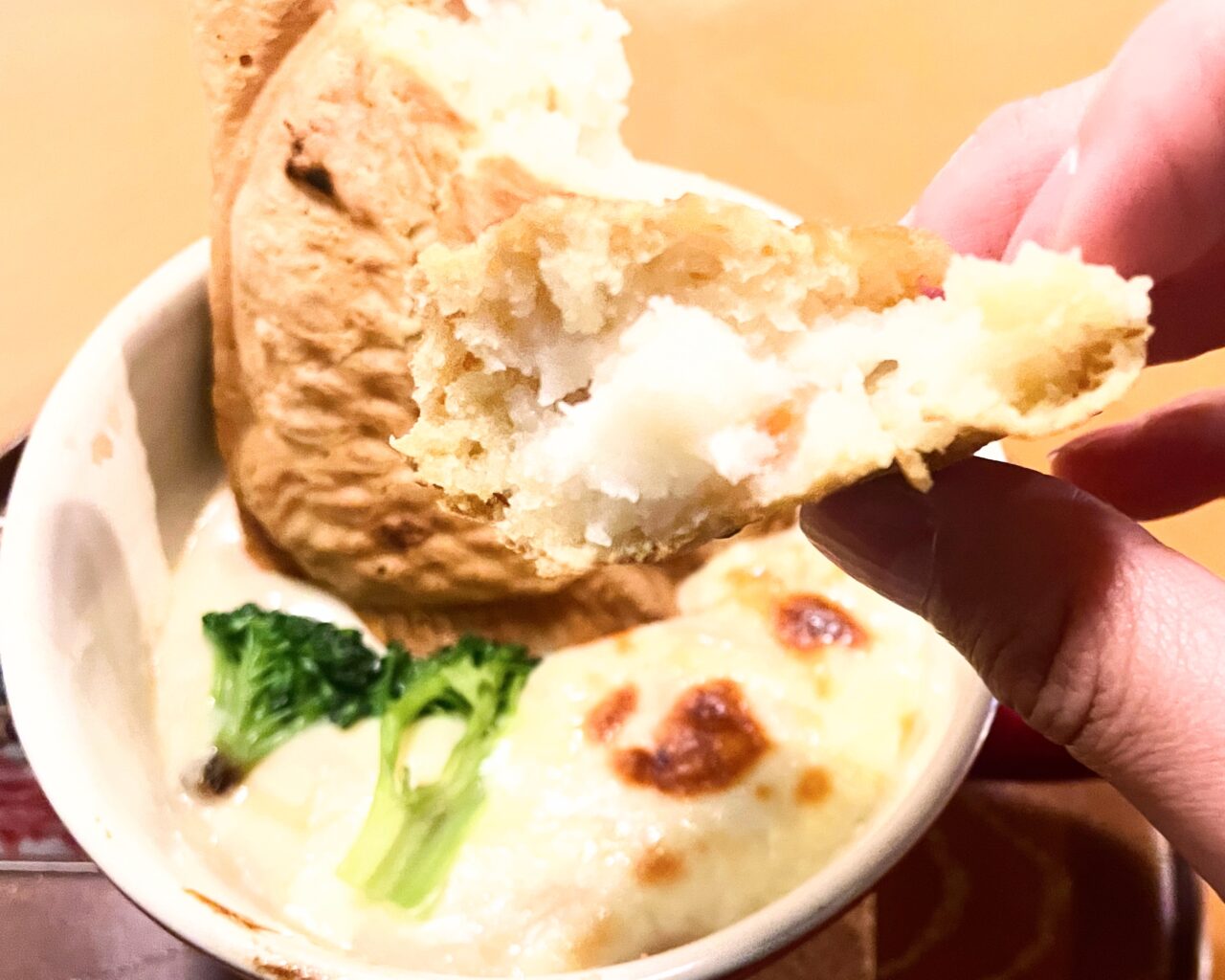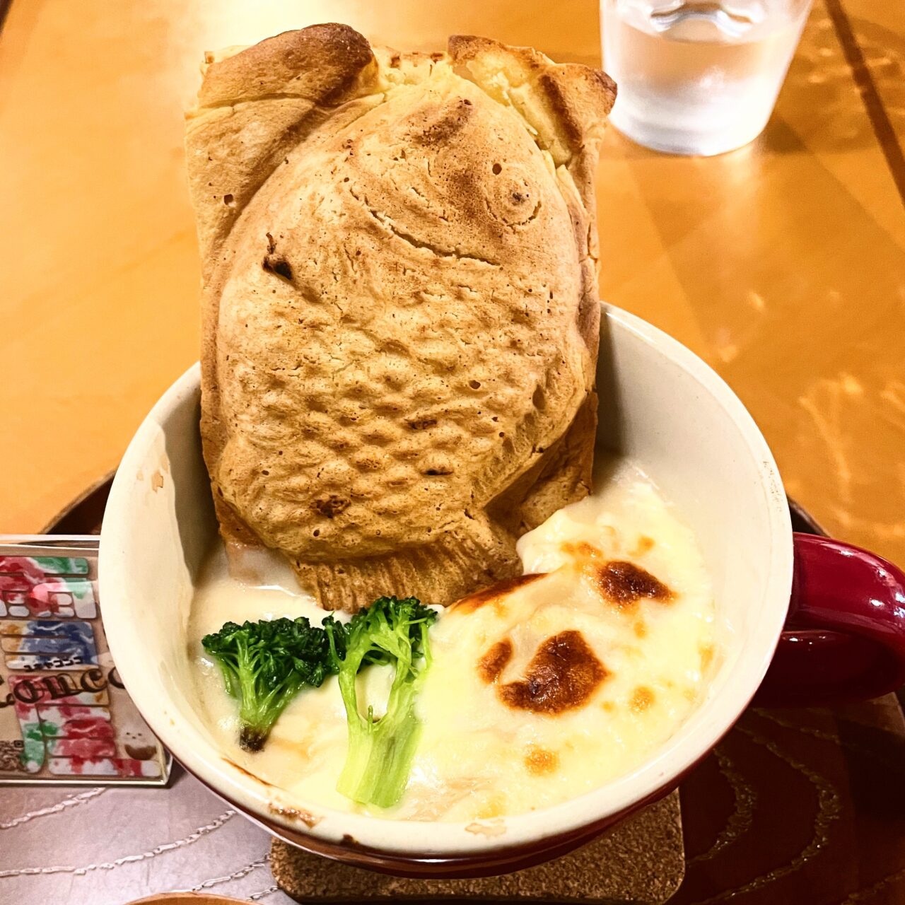 こちらはマグカップチーズ焼きシチューin鯛焼きです。たい焼きの中身はあんこではなく、ポテトサラダでした。熱々のチーズがとろ〜り、ポテトサラダのたい焼きにチーズとシチューをからめて食べると体まであたたかくなります。