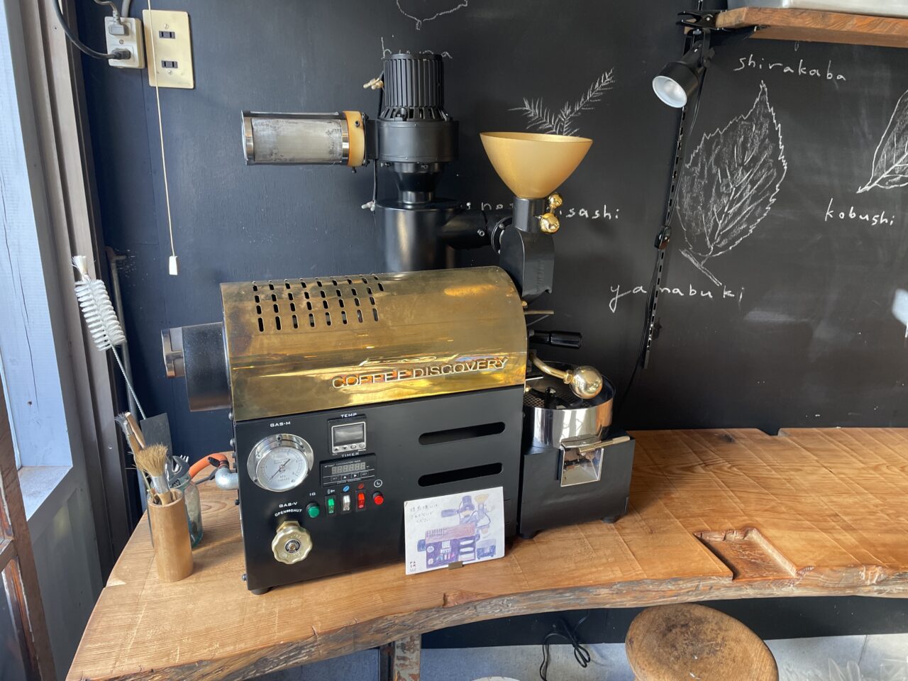 お店の中に入れば、入り口左側に珈琲の小型焙煎機があります。