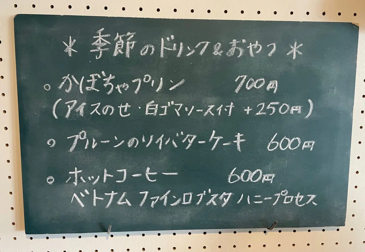 黒板に季節のドリンク&おやつが書いてます。