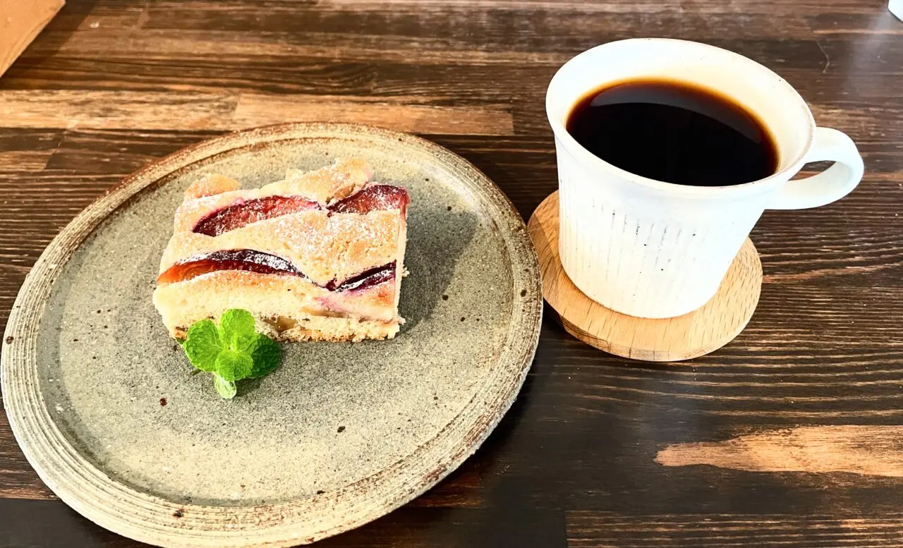 プルーンのソイバターケーキとコーヒーです。あっさりしたソイバターと少し酸味のあるプルーンは見た目赤く、食べると中には胡桃があって、ふっくらケーキに少しの酸味と優しい甘さにときどき、胡桃のカリッとした食感が美味しいケーキです。珈琲は「ベトナム産高品種ファインロブスタ種ハニープロセス」です。中深煎りのコクと少し甘味も感じられバランスのいい、飲みやすいコーヒーでした。かぼちゃにプルーンと季節を感じることができるおやつがあります。