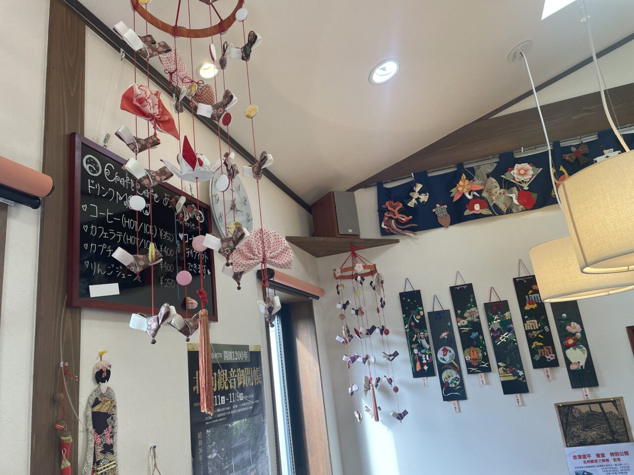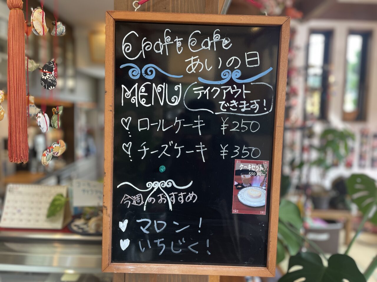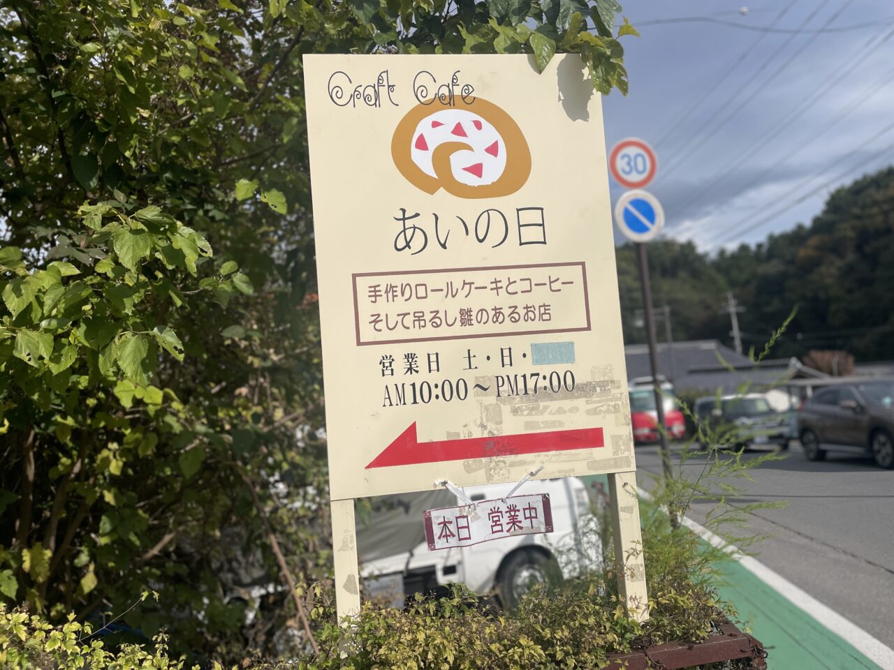 手作りロールケーキとコーヒーそして吊るし雛のあるお店と書いた看板です。