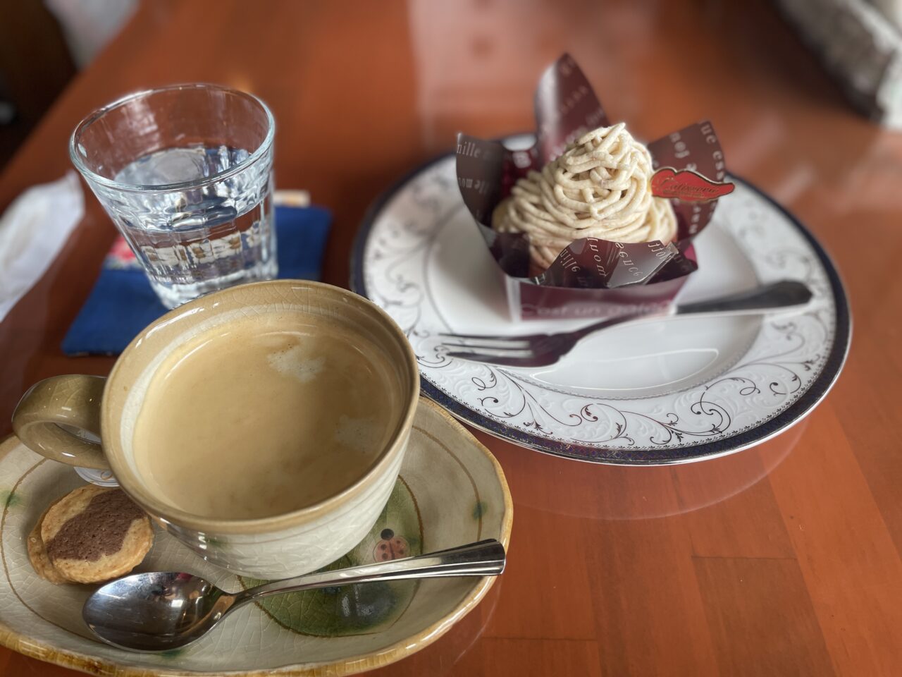 コーヒーとロールモンブランのケーキセットです。コーヒーにはクッキーがついていました。