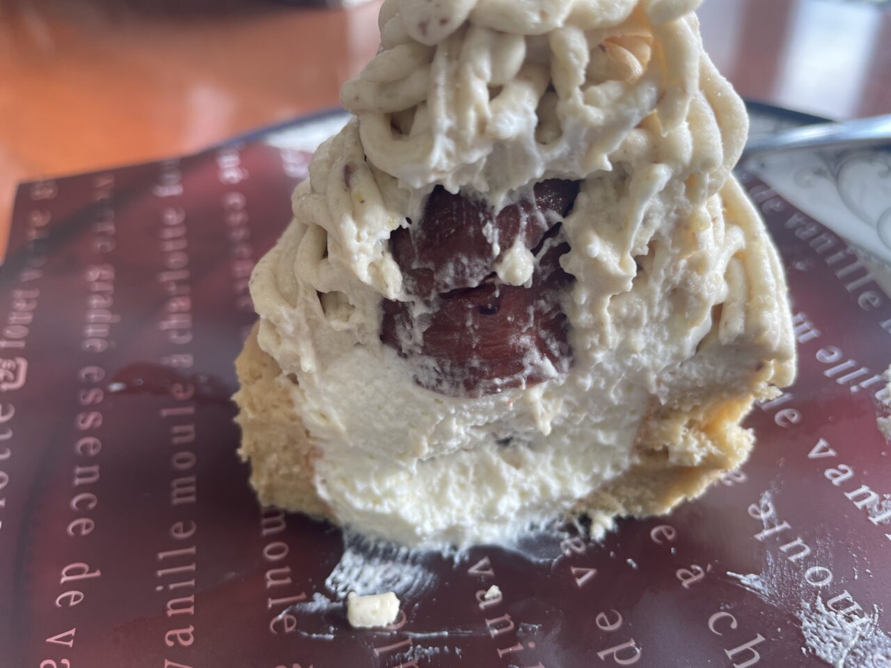 ロールモンブランの中身は栗の渋皮煮が1個ゴロッと入っていました。中の栗もマロンクリームに合わせるマロンペーストも地元産の栗を使ってすべて手作りだそうです。ロールケーキ生地のふわふわやさしい食感と栗の甘さがたまらない秋の味です。コーヒーによく合います。