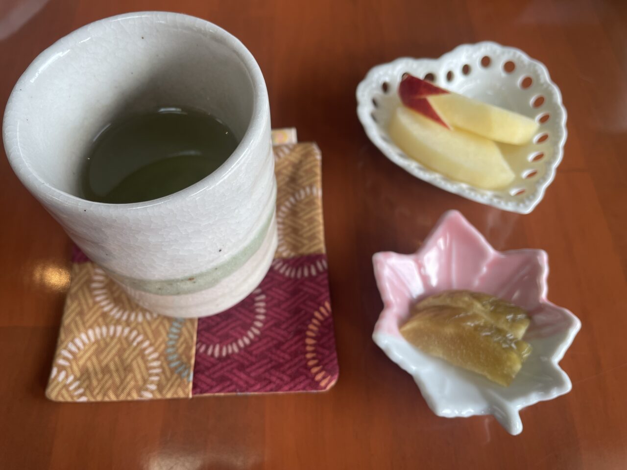 ケーキを食べて一息ついていたらお茶と手作りの奈良漬とりんごが出てきました。やさしい心づかいです。ほっこりした気持ちになります。ひとときの休息をあいの日のロールケーキはいかがしょうか