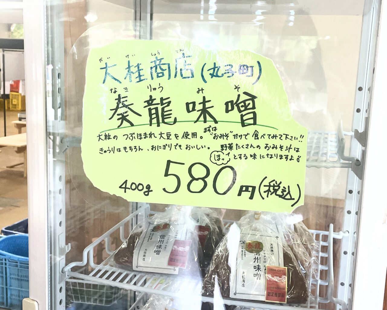 大桂商店(丸子町)奏龍味噌です。「大粒のつぶほまれ大豆を使用しています。まずはお味噌だけで食べて見てください。きゅうりはもちろん、おにぎりでも美味しい。野菜たくさんのおみそ汁はほっとする味になりますよ」