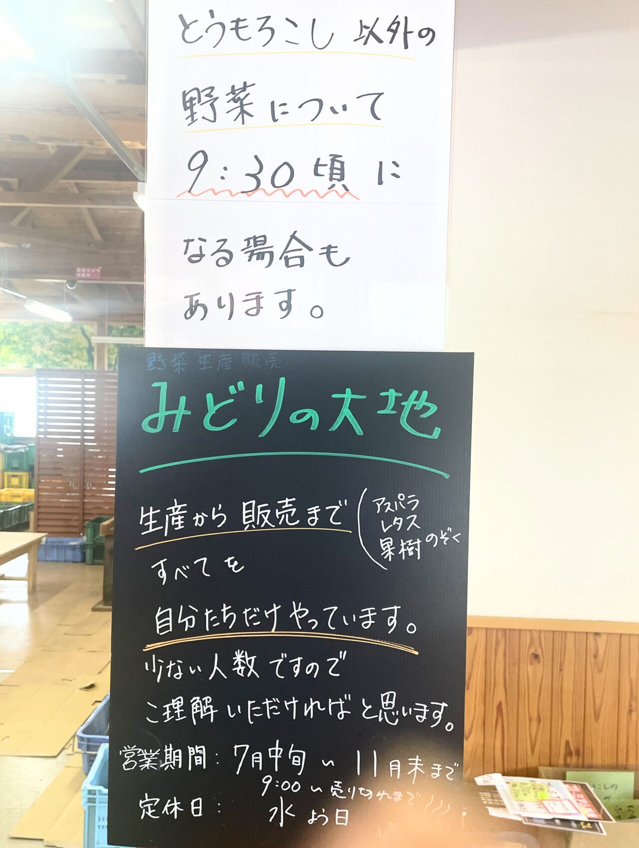「生産から販売まですべて自分たちだけやっています」と書かれた黒板があります。美味しい野菜作りを追求しています。美味しい野菜をお客様にお届けするには、そこに「旬なタイミング」と「品種選定」が大切です。とInstagramで紹介されています。営業期間は7月中旬から11月末までです。営業時間は朝9時から売り切れるまでとのことでした。
