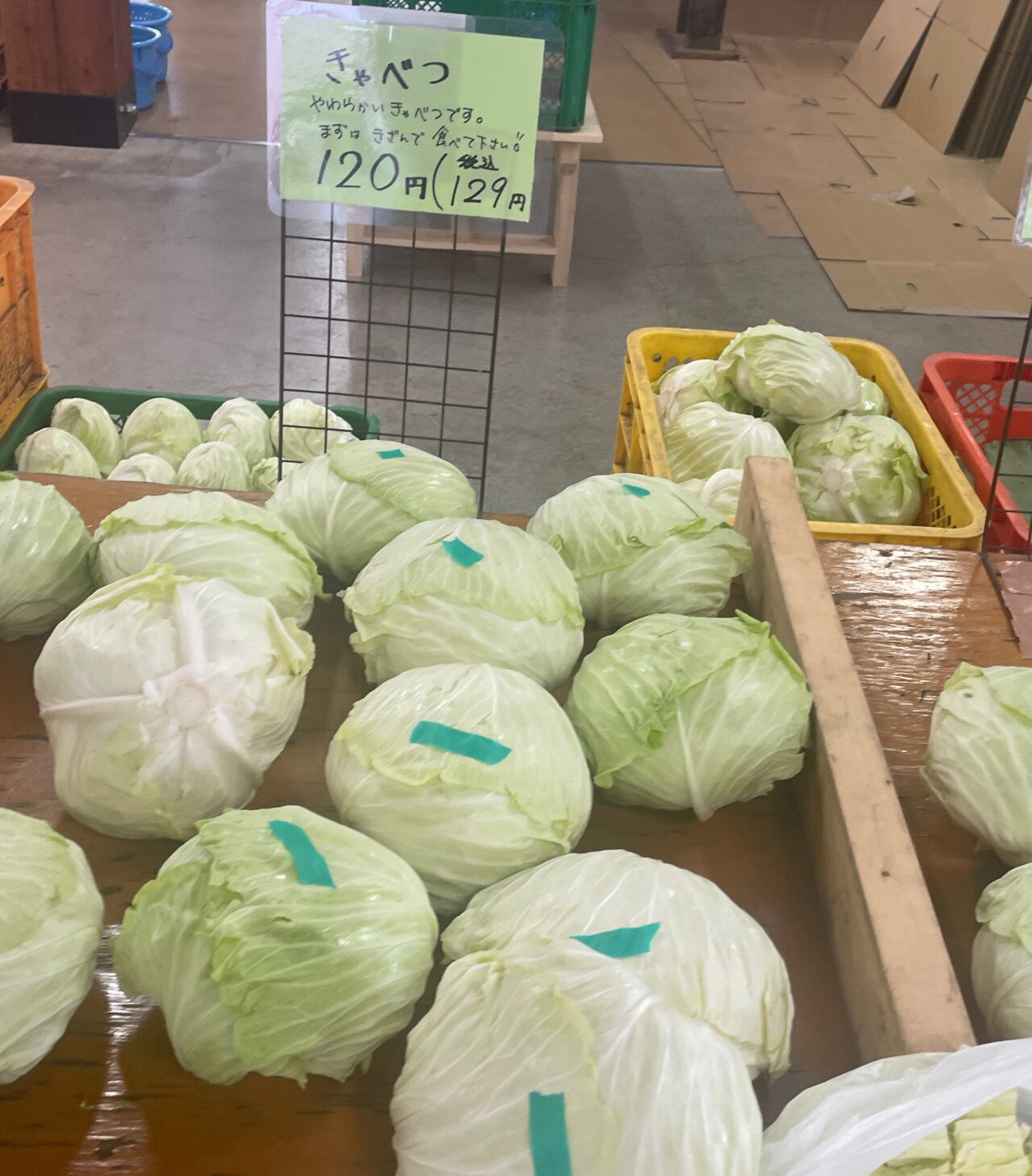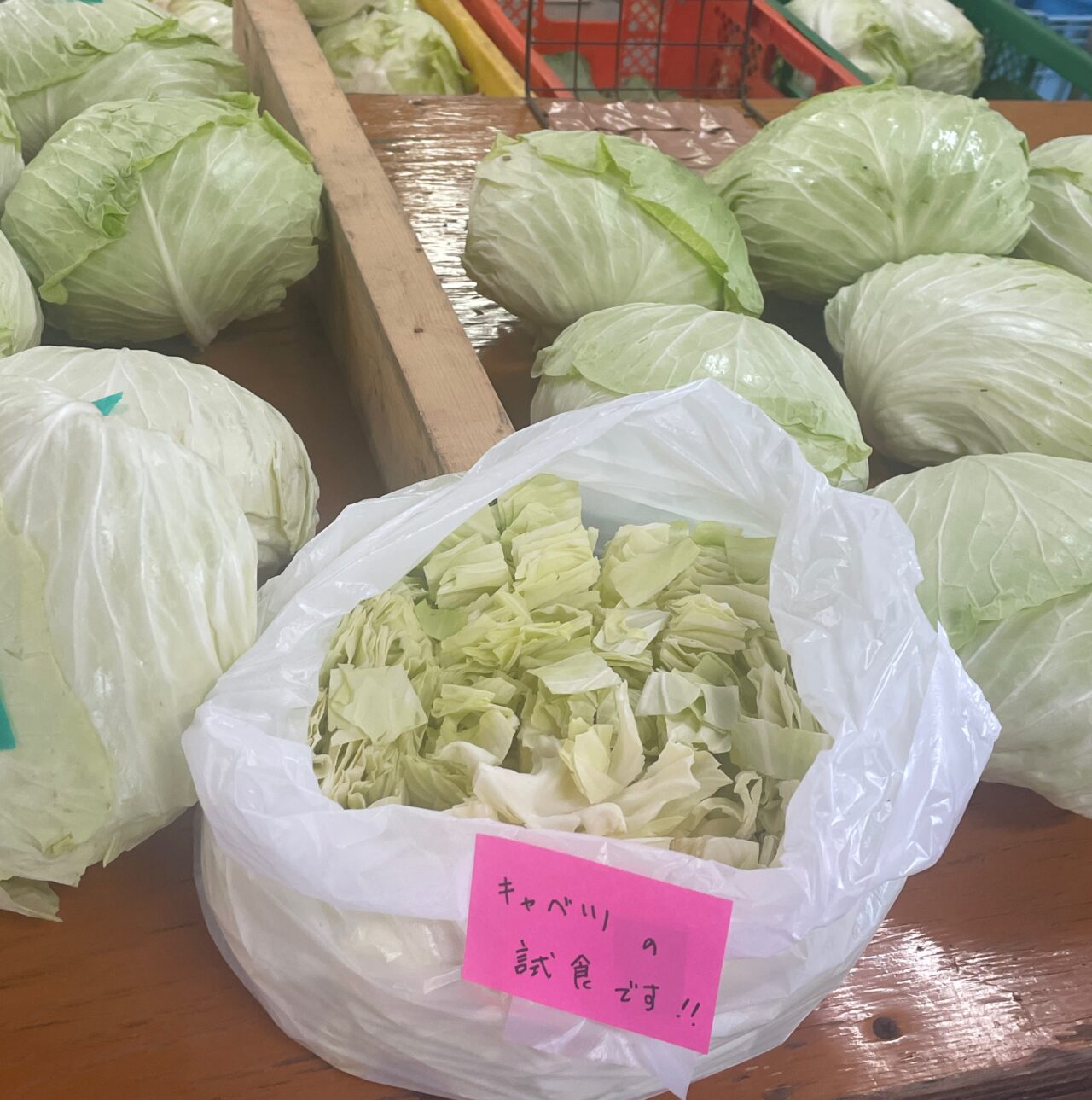キャベツの試食もあります。パリッとみずみずしいキャベツです。キャベツはそろそろ終わりそうなのでお求めの方はお急ぎくださいとのことです。