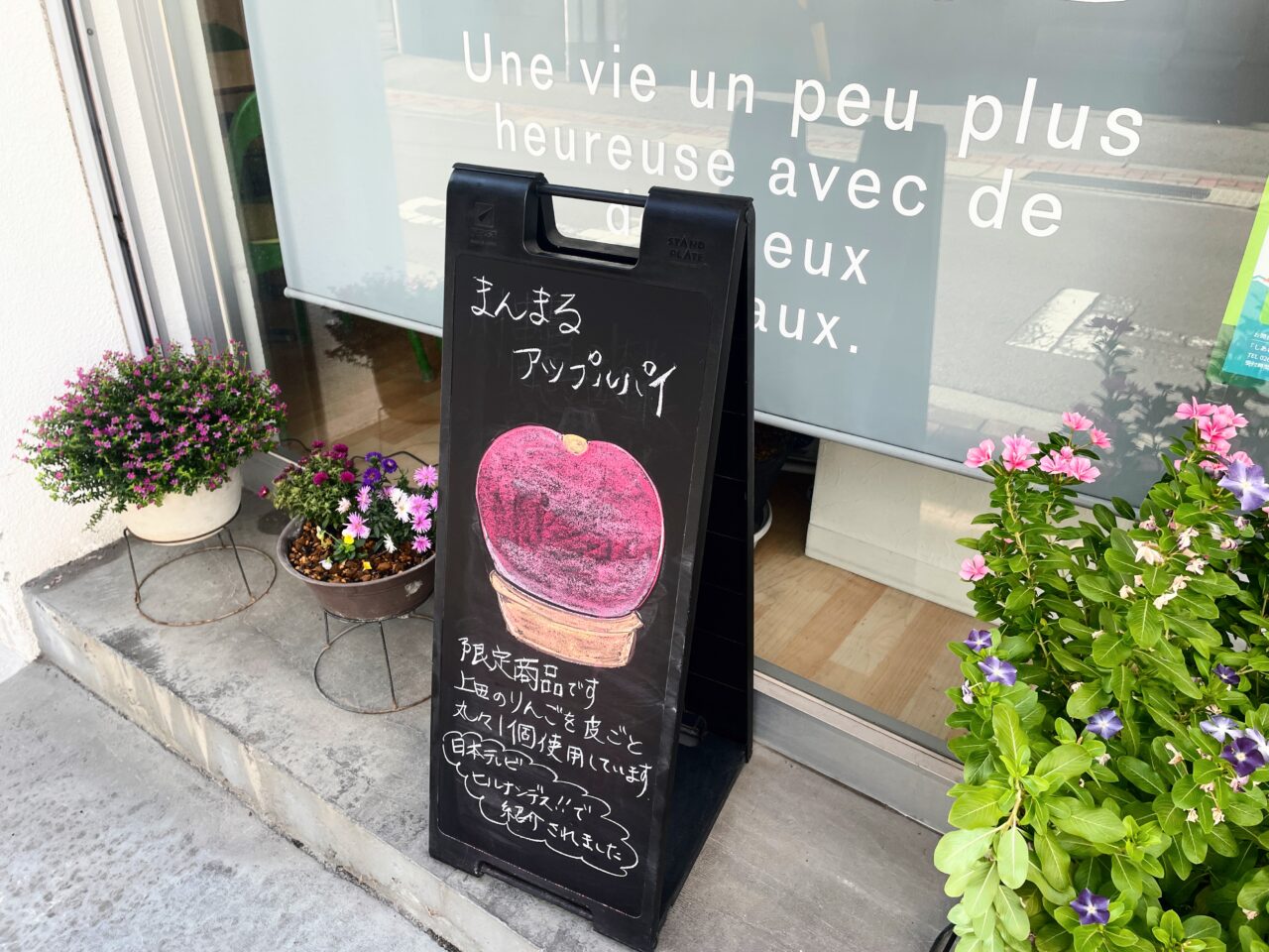 お店の前の看板には「まんまるアップルパイ」の絵があり限定商品です。上田のりんごを皮ごと丸々1個使用しています。日本テレビ「ヒルナンデス!!」で紹介されましたとあります。