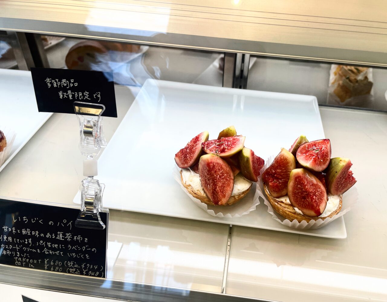 こちらも季節商品です。甘味と酸味のある蓬菜柿を使用しています。パイ生地にラベンダーのカスタードクリームを合わせていちじくを飾りましたとあります。