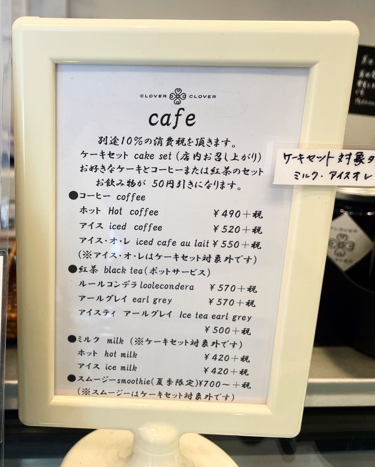 ドリンクメニューです。お好きなケーキとコーヒーまたは紅茶のセットはお飲み物が50円引きになります。