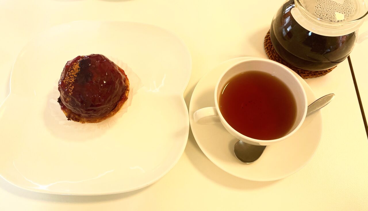 ナイフを入れるとサクッと簡単に切れます。中にはアーモンドクリームが見えます。よく焼けたりんごはぎゅっと旨味が凝縮されていてしっかり食感も残っています。パイと一緒に食べると美味しくて食べ応えもあります。りんごの甘味とほんのりシナモンのアクセントが紅茶によく合います。店員さんが秋映の入荷が終わり次第こちらのメニューは販売終了だそうです。11月中旬までかなとお話されてました。すべて手作業で丁寧に作られているので1日の製造数に限りがあります。お気軽にお電話でお問い合わせ下さいとのことでした。