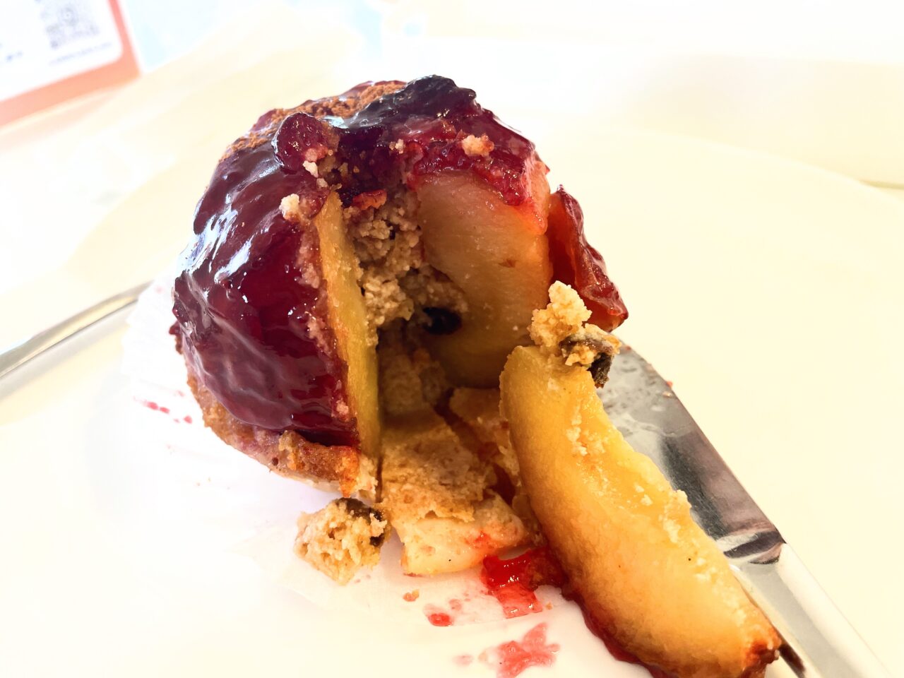 看板にもあった「まんまるアップルパイ」です。りんごの芯をくりぬき、アーモンドクリームを絞り、パイ生地に乗せてオーブンで1時間じっくり焼きました。レーズンとシナモンがアクセントですとあります。りんごは秋映を使っているそうです。