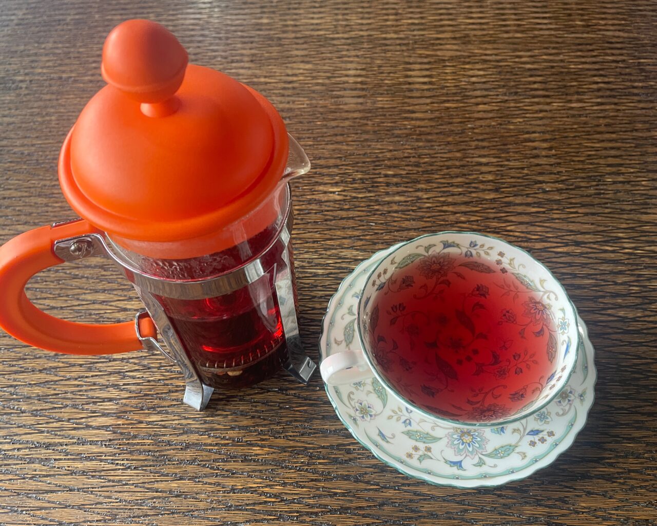 こちらはフルーツガーデン(ドライフルーツのホットドリンク)です。ノンカフェインで、ハイビスカスやローズヒップなどミックスしたホットドリンクです。茶葉がなくても酸味も少なくドライフルーツのやさしい甘味がホッとする飲みやすいお味でした。