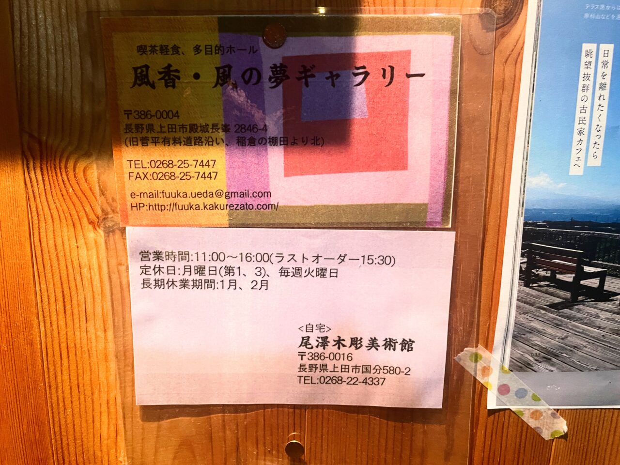 以前、掲載された雑誌が貼ってあります。農民美術作家の尾澤敏春さんが新潟から築158年の古民家を移築し、芸術仲間の交流拠点として開いたお店だそうです。