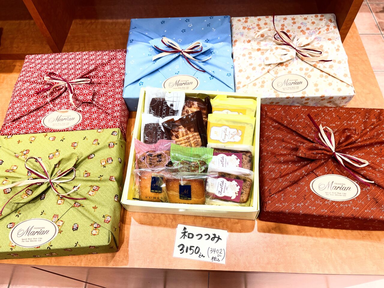 店内には風呂敷に包まれた焼き菓子などもありました。希望の焼き菓子を包んでもらえるようなので手土産にいいですね。