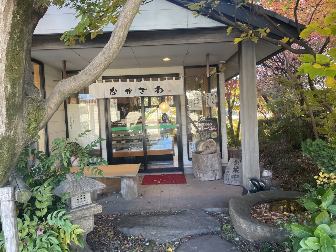 木々に囲まれ、なかざわの暖簾がかかっているのがお店の入口です。
