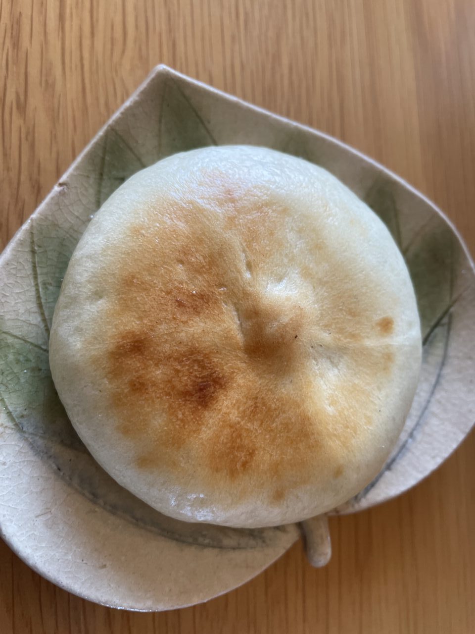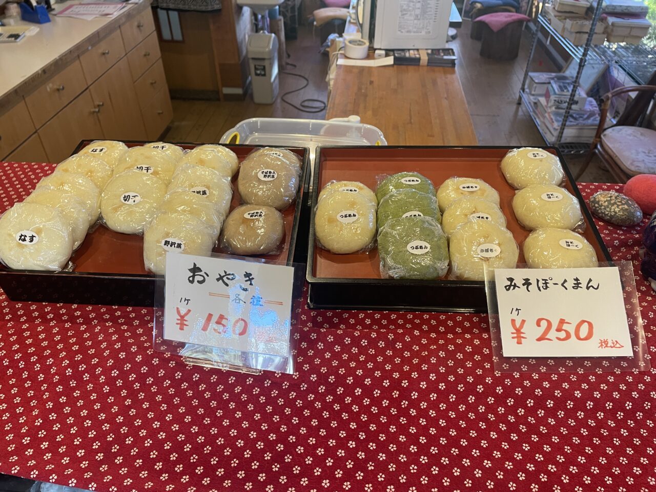 ショーケースの上にはおやきが並んでいます。みそポークまん、かぼちゃ、つぶあん、蕎麦粉入り野沢菜、野沢菜、切干、なすがあります。こちらのおやきは焦げ目をつけてから蒸してあるため、皮の部分には油を含んでおらず、食感もふんわりとした感じがあり、おやつとして何個か食べてもしつこくありません。