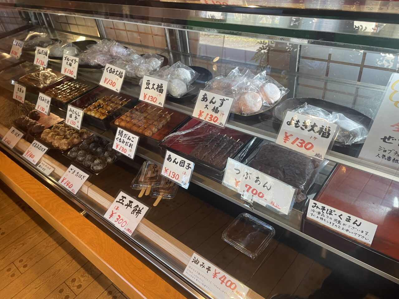 お店に入るとショーケースが目の前にあります。五平餅、ごまおはぎ、くるみおはぎ、おはぎ、揚げ団子くるみだれ、みたらし団子。あん団子、ごま大福、ずんだ大福、ブルーベリー大福、くるみ大福、豆大福、あんず大福、よもぎ大福が並んでいます。