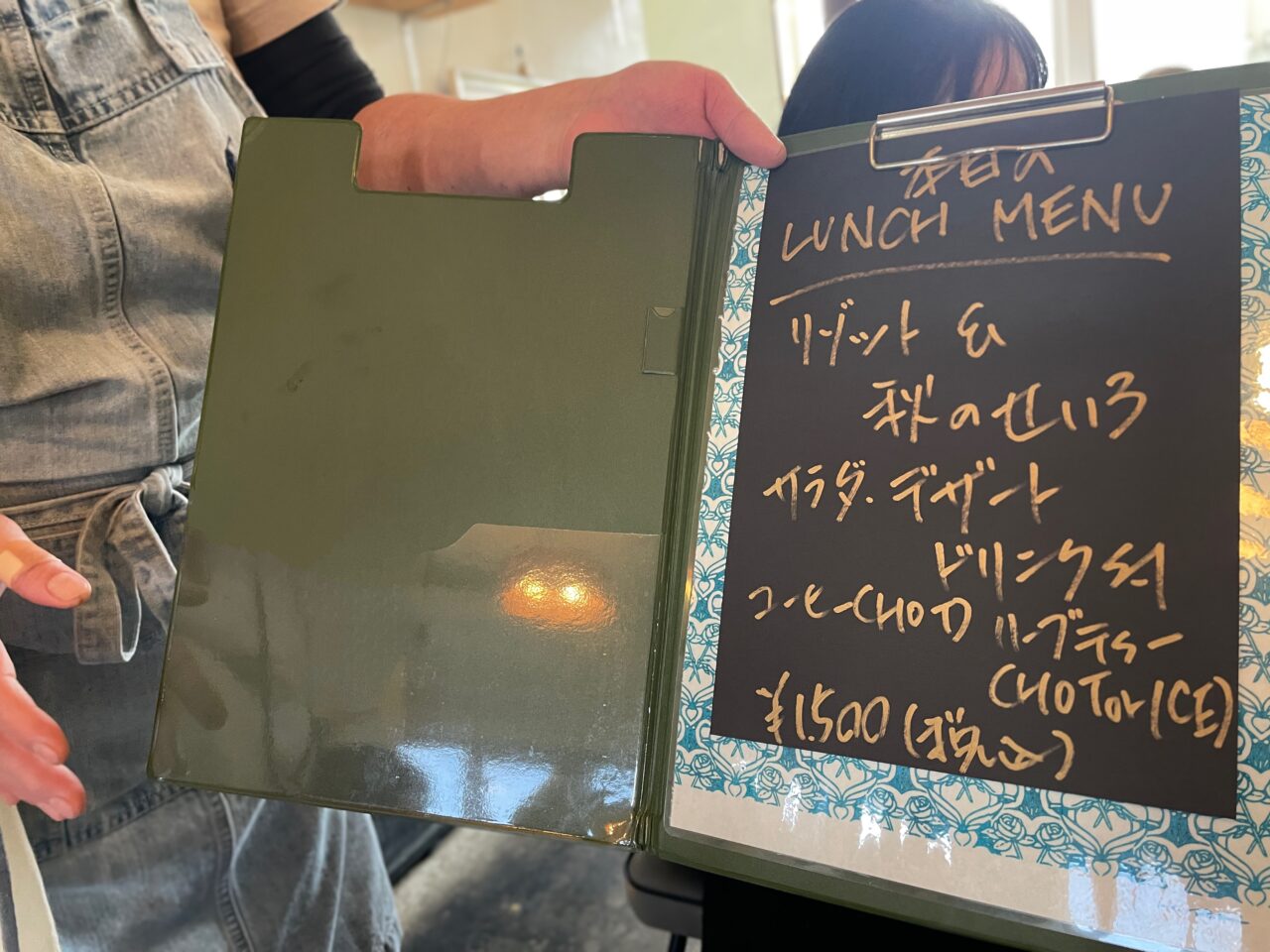 本日のランチメニューはリゾットと秋のせいろ、サラダ、デザートとドリンクのセットです。ドリンクはコーヒーとハーブティーのどちらかが選べます。