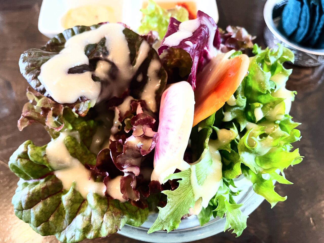 サラダは手作りのドレッシングがかかって出てきました。このドレッシングがベビーリーフやトレヴィスが引き立つクリーミーでマイルドな美味しいドレッシングでした。