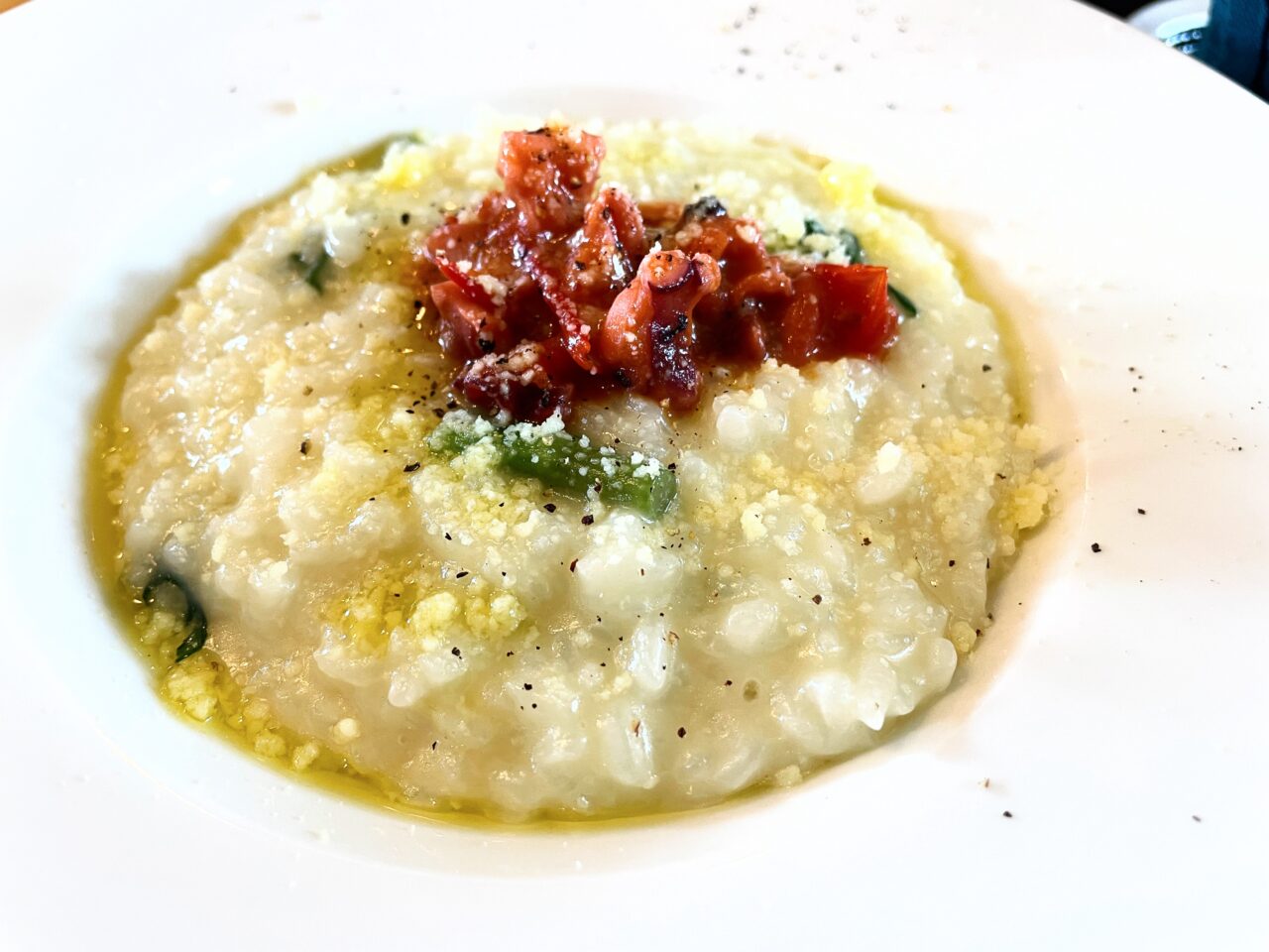 タコとフルーツトマトのチーズリゾットです。チーズのこくがご飯に絡んでタコやフルーツトマトのアクセントで濃厚なのに重すぎず程よい塩加減が最後まで美味しい一皿でした。