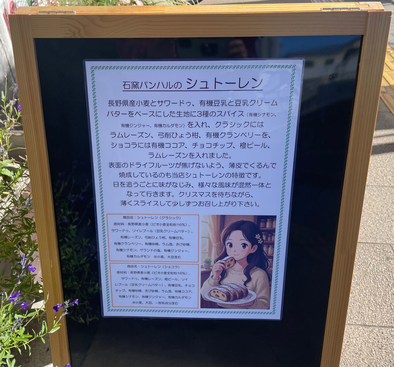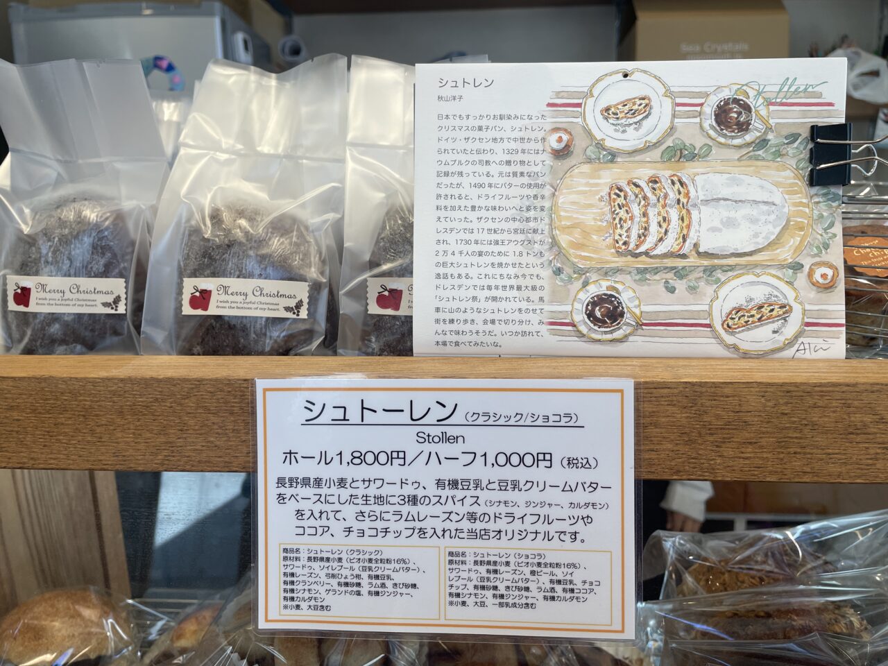 クリスマスの発酵菓子で口溶けよく、フルーツやスパイスの香りが味わえるので薄くスライスして食べます。季節もので量産ができないのでタイミングによっては売り切れの可能性もあるそうです。クリスマスプレゼントにおすすめとのことです。素材にも製法にもこだわったパンは消化にもよく身体にもやさしいパンです。朝ごはんやプレゼントにパンはいかがでしょうか
