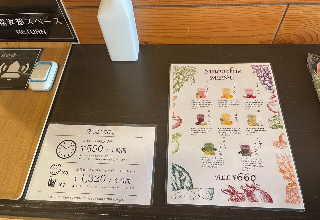 1時間550円利用はコーヒー・水素水がフリードリンクです。(スムージー別料金)3時間1,320円利用はお好きなスムージー1杯とコーヒー・水素水がフリードリンクです。スムージーは単品でお持ち帰りされているお客様もいました。