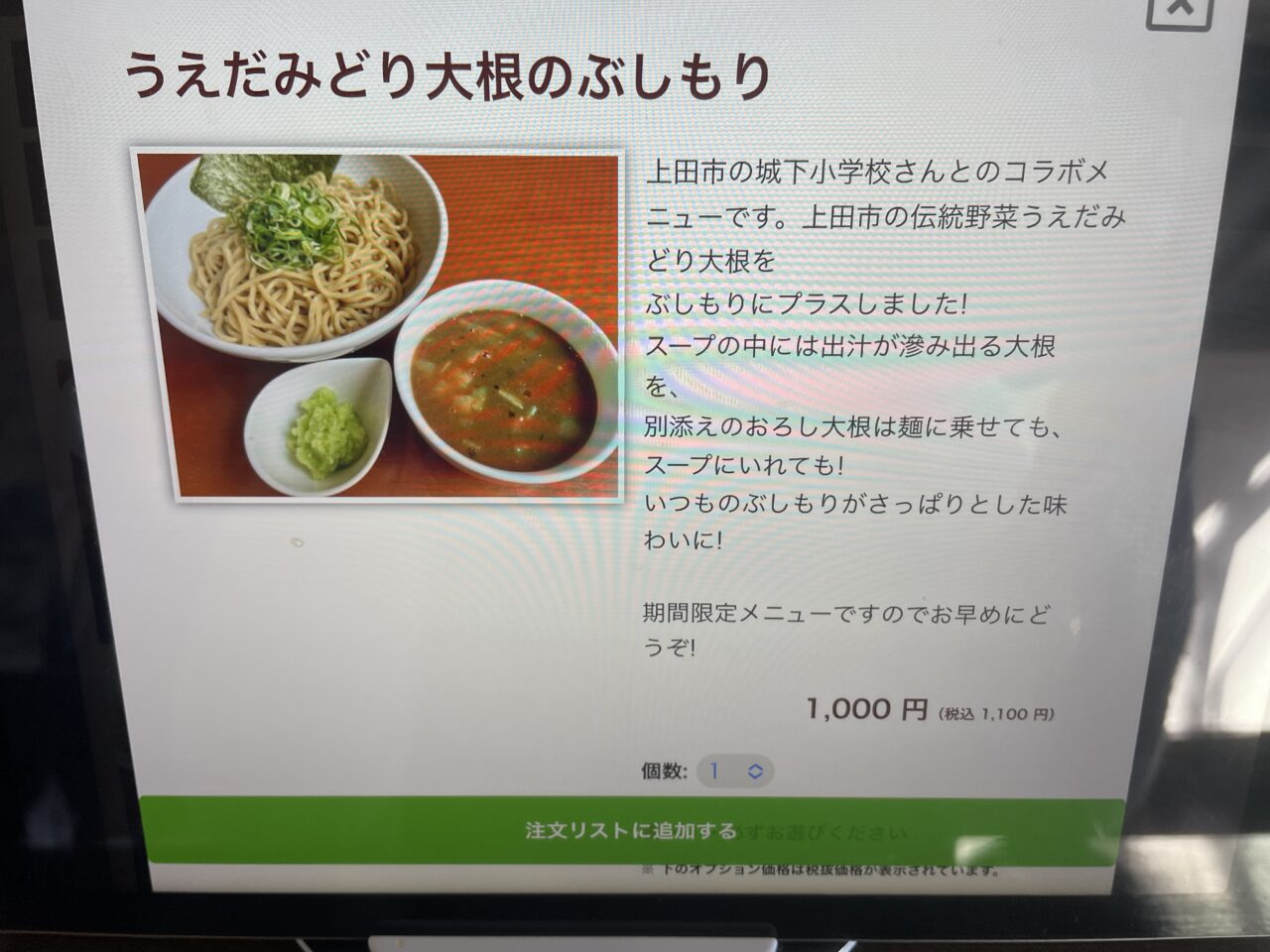 上田市の城下小学校とのコラボメニューです。上田市の伝統野菜うえだみどり大根がぶしもりにプラスされています。期間限定メニューです。