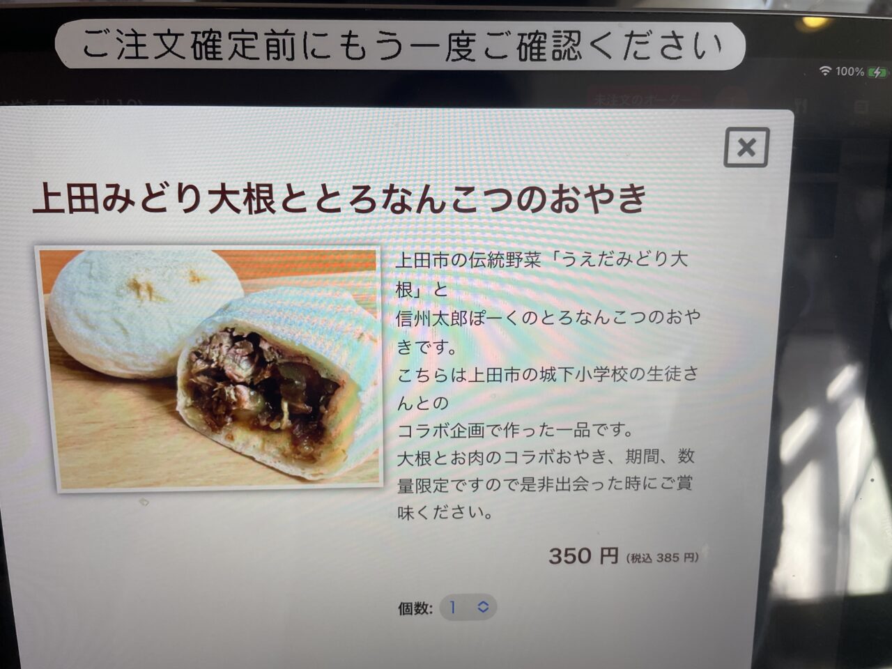こちらも城下小学校とのコラボメニューでうえだみどり大根ととろとろ軟骨のおやきも期間限定数量限定メニューです。信州太郎ポークのとろなんこつのおやきです。