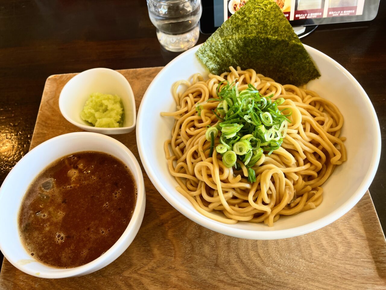 太麺に濃厚な豚骨魚介スープとうえだみどり大根のおろしが別皿にあります。