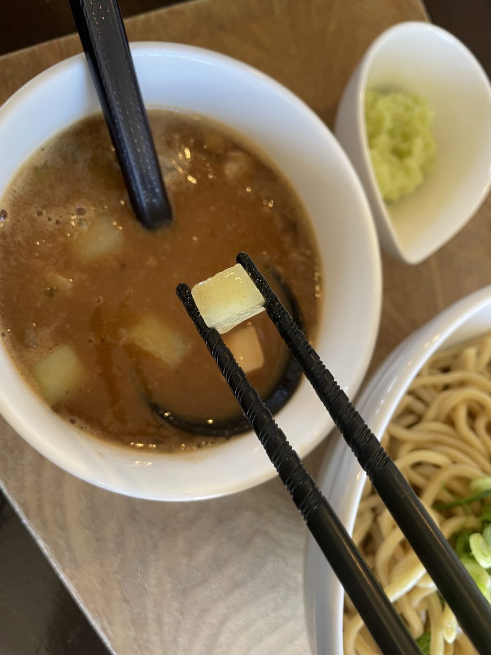 スープにはごろごろ入った角煮やメンマ、そして角切りのうえだみどり大根もしっかり入っていました。